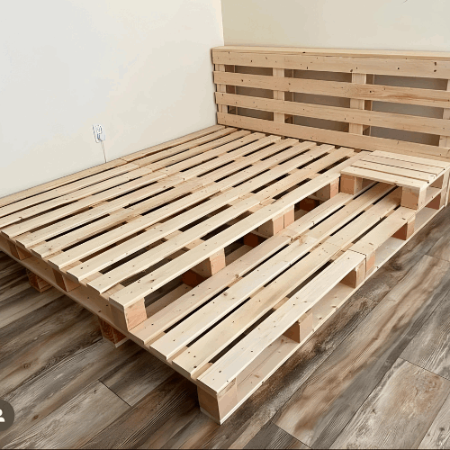 Enhance Your Bedroom Create a tranquil and stylish bedroom with the Queen Size Pallet Bed featuring foot and headrests, paired with a practical bedside table. Embrace sustainable living with handcrafted pallet furniture that blends rustic charm with functional design. Order yours today and elevate your bedroom decor with timeless elegance and comfort.