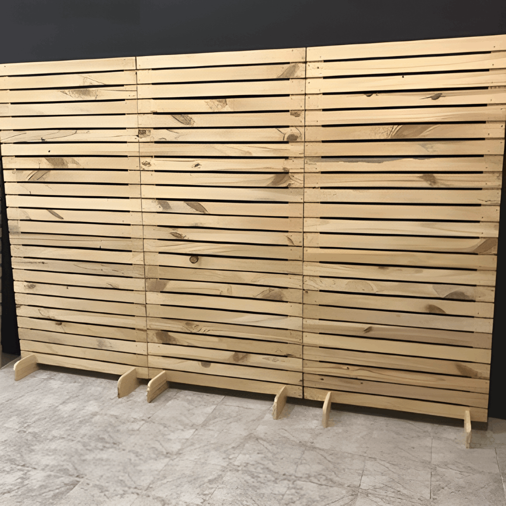 Perfect for Any Setting Whether used in homes, offices, or retail spaces, the Pallet Wall with Leg Support adds character and functionality. It serves as a versatile backdrop or organizational hub, enhancing the ambiance of your space while offering practical storage and display solutions.
